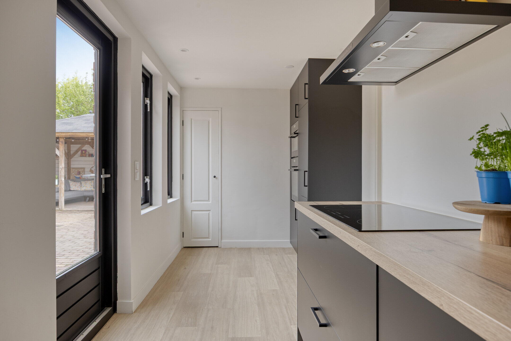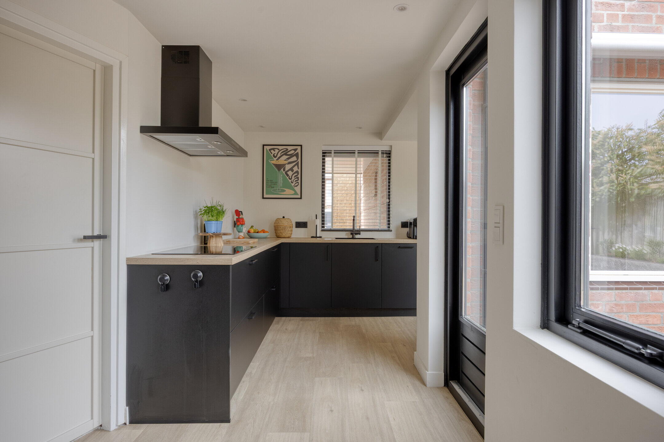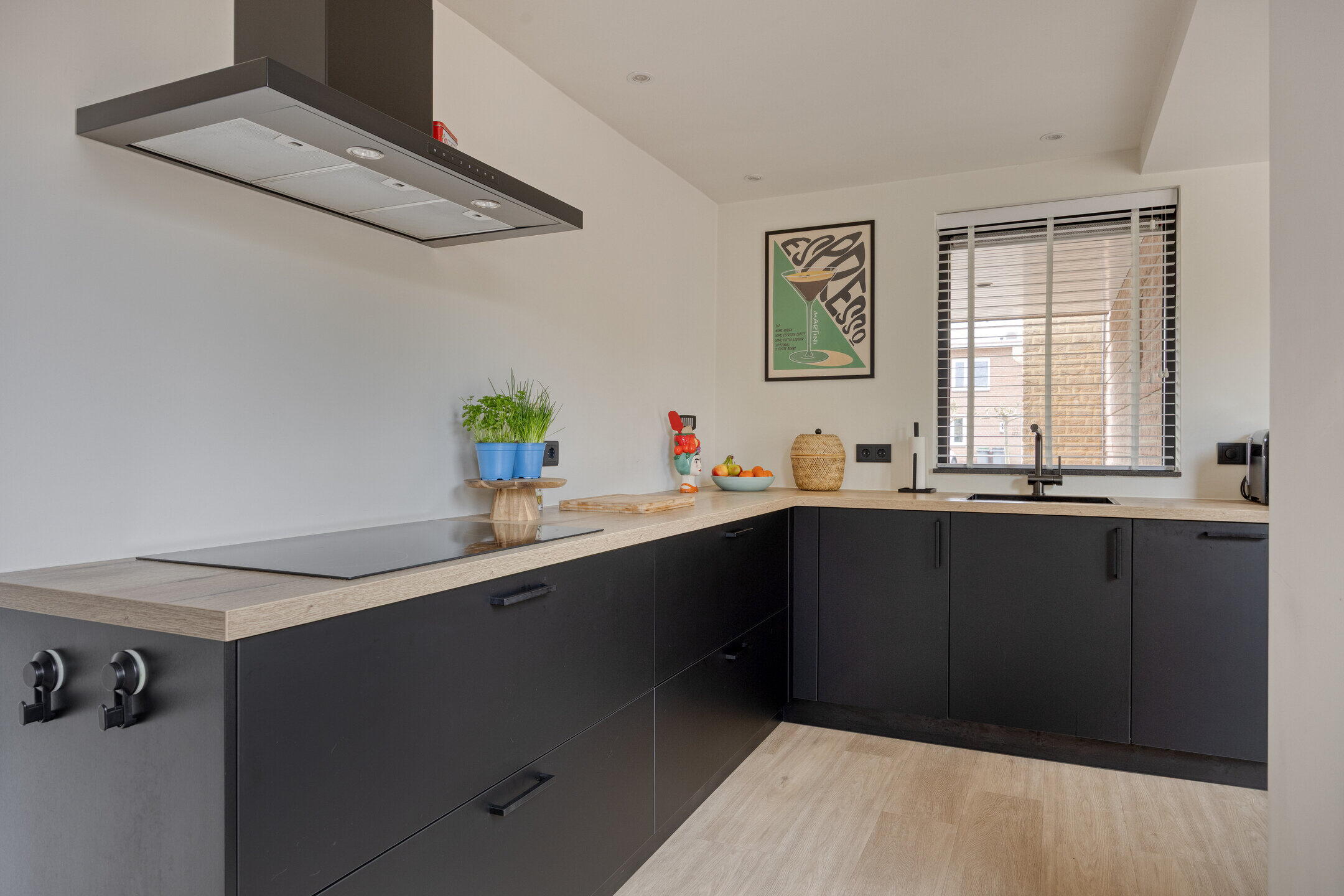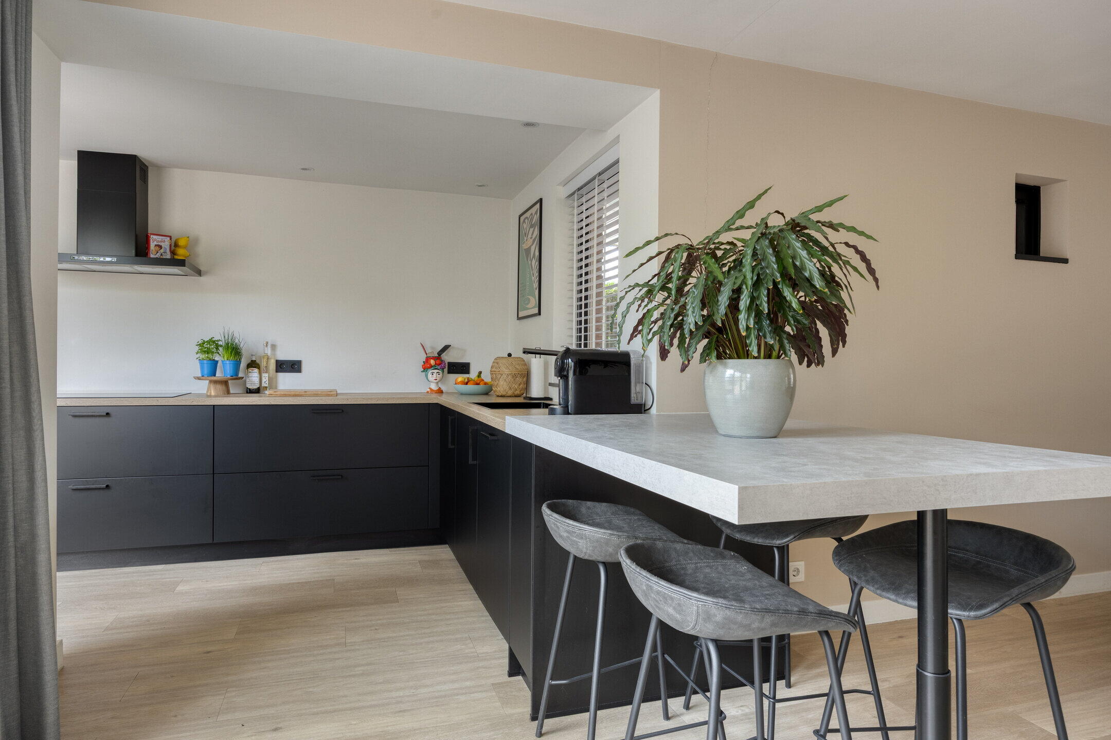 De zwarte keuken vormt een prachtig geheel met de woonkamer en gaat naadloos over in de leefruimte. De keuken is uitgevoerd in een strakke, eigentijdse stijl met donkere fronten en een licht werkblad, wat zorgt voor een luxe en warme uitstraling. Het ruime werkblad met barfunctie nodigt uit tot gezellig samenzijn, terwijl er volop werk- en bergruimte aanwezig is. Vanuit de keuken bereik je de bijkeuken met tegelvloer en tevens te bereiken vanaf de voorzijde. Via de hal bereik je het toilet en de trap naar de eerste verdieping.