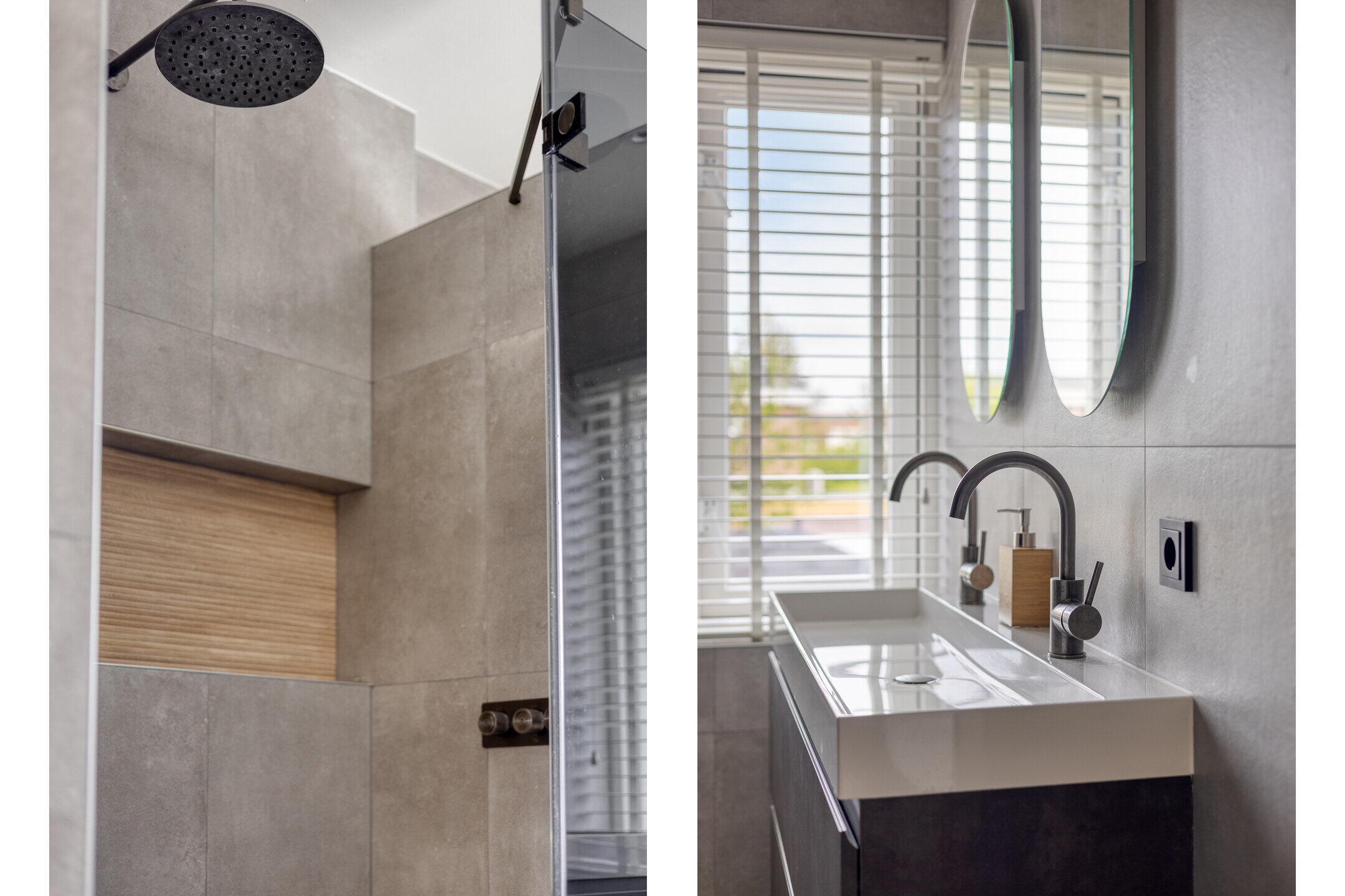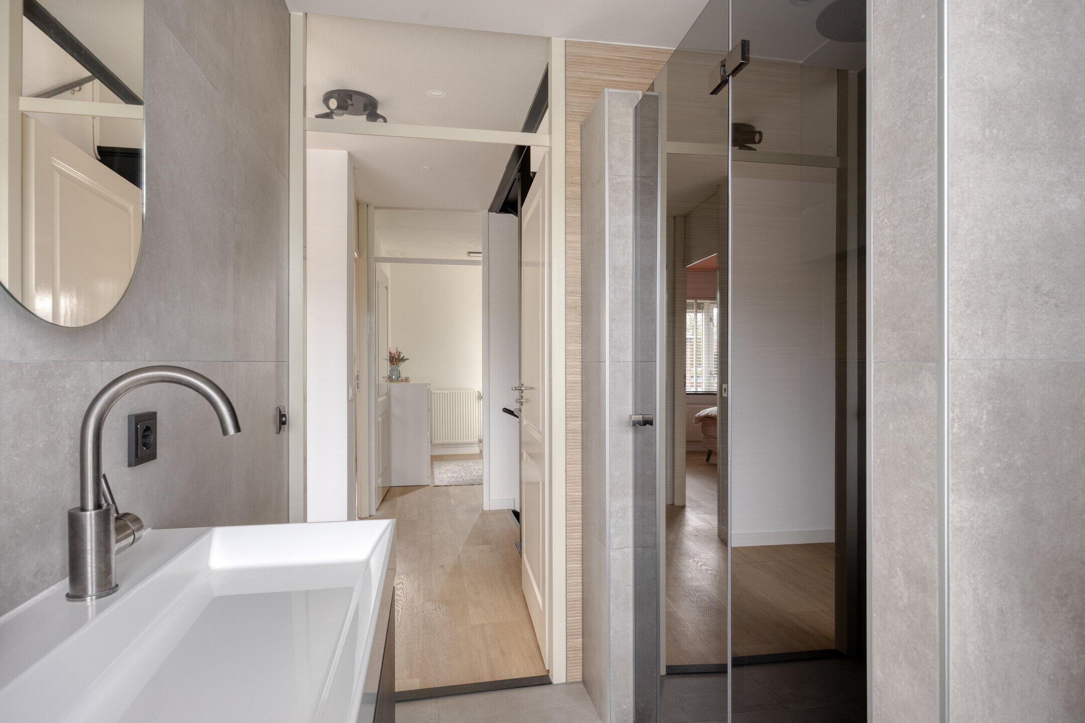 Overloop met toegang tot drie slaapkamers en een aparte wasruimte. De moderne badkamer is stijlvol en luxe afgewerkt en voorzien van een inloopdouche met glazen wand en regendouche, een royaal wastafelmeubel en de twee ronde spiegels geven de ruimte een elegante en moderne touch.