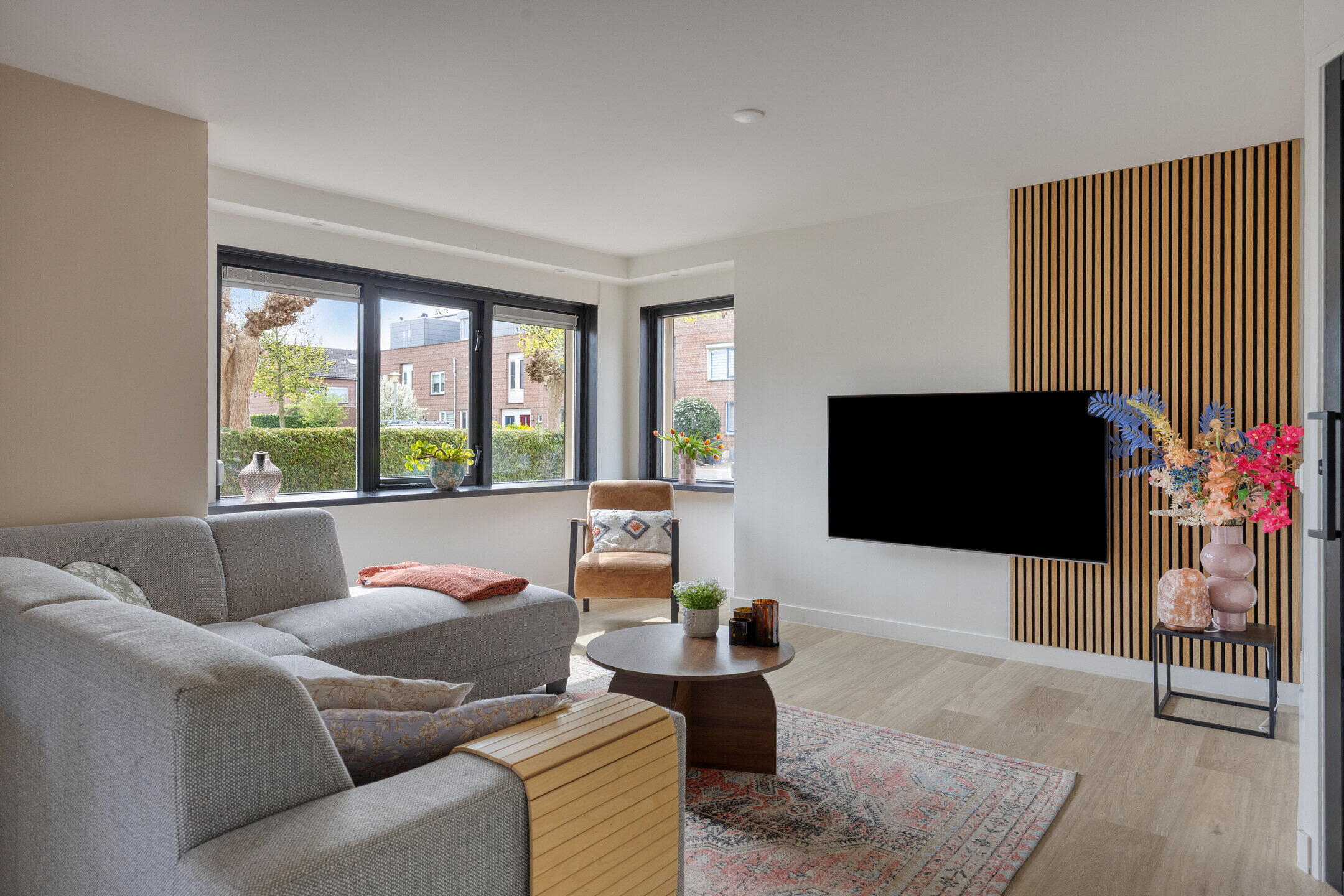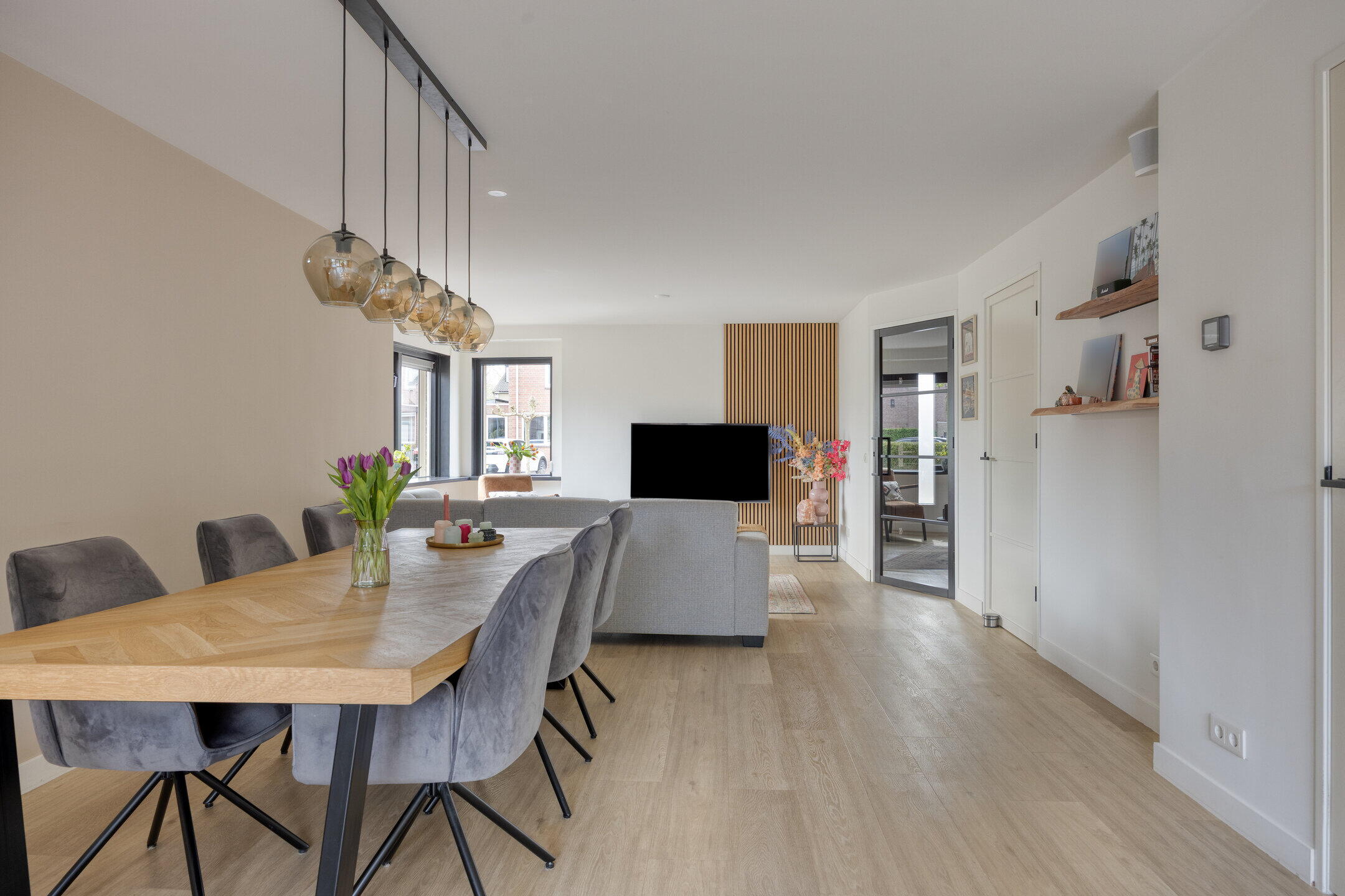 Entree met meterkast en toegang tot de ruime woonkamer met erker. Aan de achterzijde bevindt zich de uitgebouwde woonkamer. Dankzij de openslaande deuren en de open indeling geniet je hier van een fijne lichtinval en een ruimtelijk gevoel. De ruimte is afgewerkt met een stijlvolle pvc vloer in houtlook die in combinatie met de aanwezige vloerverwarming zorgt voor een aangenaam wooncomfort. De woonkamer staat in open verbinding met de eetkamer en keuken, waardoor een gezellige en uitnodigende leefomgeving ontstaat — perfect voor zowel het dagelijks leven als het ontvangen van gasten.